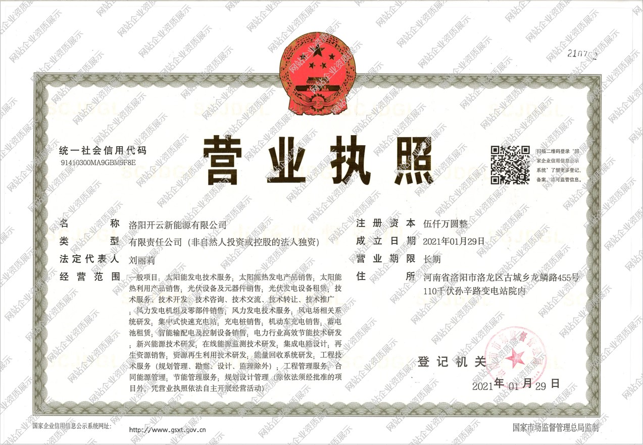 热烈庆祝洛阳开云新能源有限公司成立 洛阳开云新能源有限公司注册成立,润奥供电公司100%控股。经营方向是探索、发展屋顶光伏、风电等分