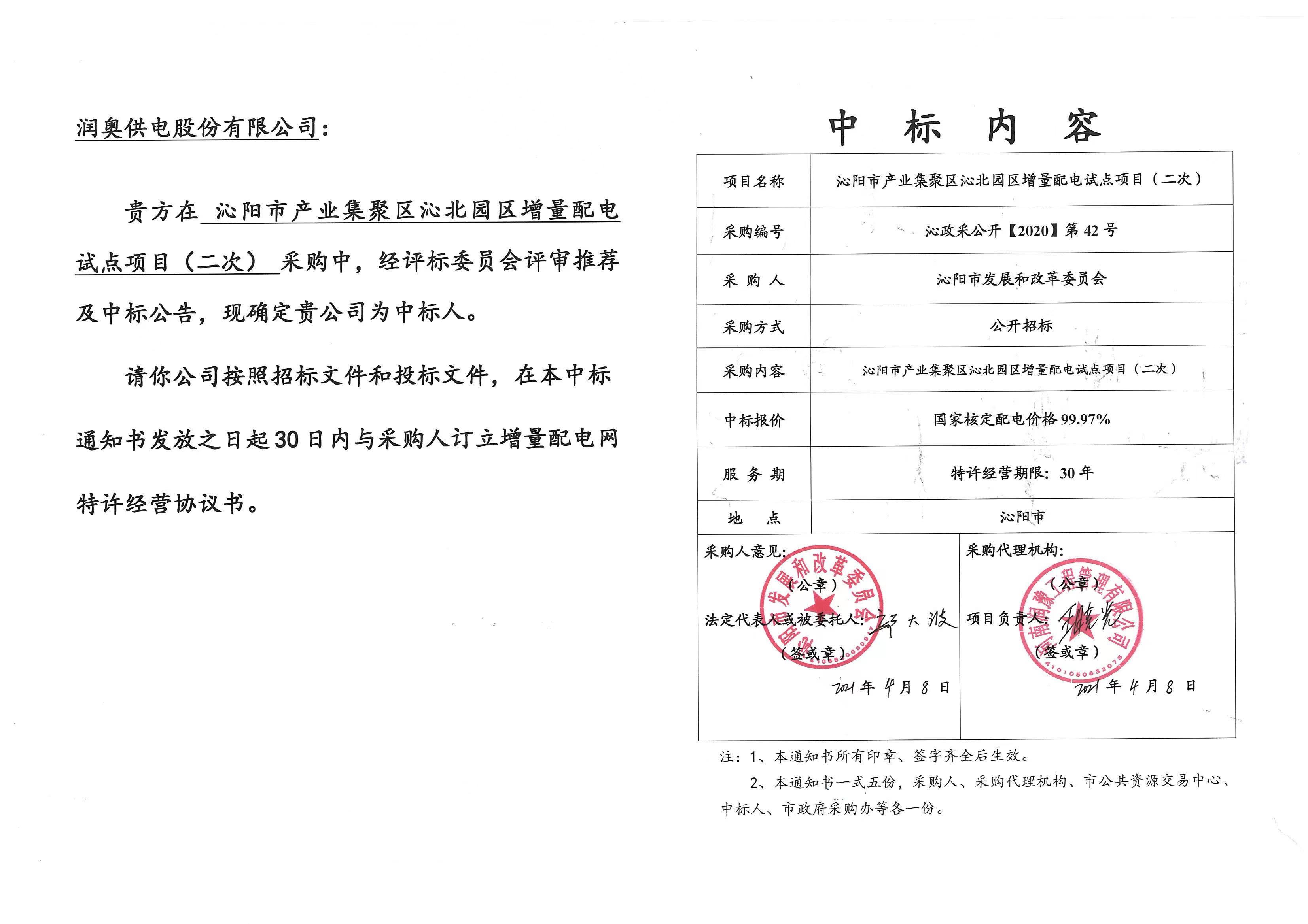 恭祝润奥供电股份有限公司中标沁阳市产业集聚区沁北园区增量配电试点项目 2021年4月8日,润奥供电股份有限公司中标沁阳市产业集聚区沁北